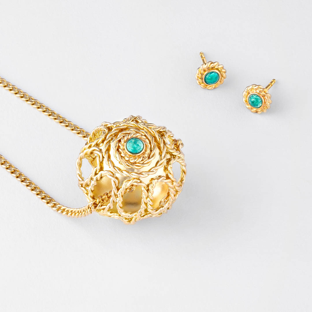 Cabochon de Paraïba au cœur d’une délicate torsade d’or, faites à la main.